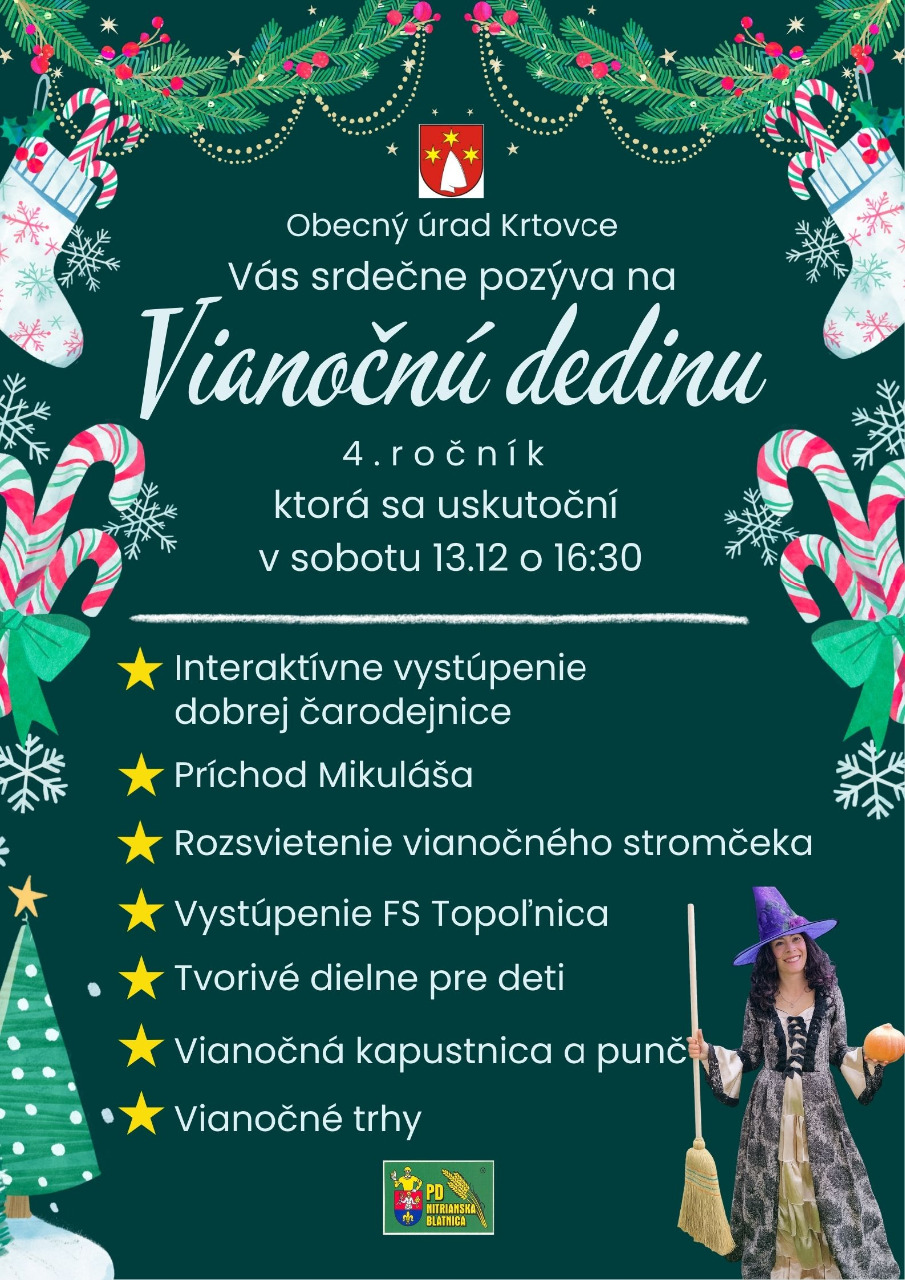 Obecný úrad v Krtovciach Vás pozýva na vianočné posedenie s oslavou príchodu Mikuláša, ktoré sa uskutoční dňa 13.12.2025 (sobotu) so začiatkom o 16:30 hod. v Kultúrnom dome v Krtovciach. Pripravené sú darčeky pre deti s trvalým pobytom v obci Krtovce, vianočný balíček do každej rodiny, vianočná kapusnica. Prosíme občanov, ktorí chcú venovať svojich vnúčatám darček, ktoré nemajú trvalý pobyt v obci, aby si zabezpečili balíčky a priniesli podpísané na Obecný úrad.